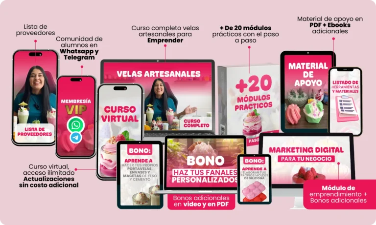 El curso es hermoso y las clases son muy claras. La plataforma me funcionó perfecto y aprendí a hacer mis velas rápidamente porque la profesora explica con muchísima paciencia. Gracias a Dios ya tengo mis primeros pedidos y poco a poco mi emprendimiento va creciendo. Sin duda, este curso está hecho con mucho amor.